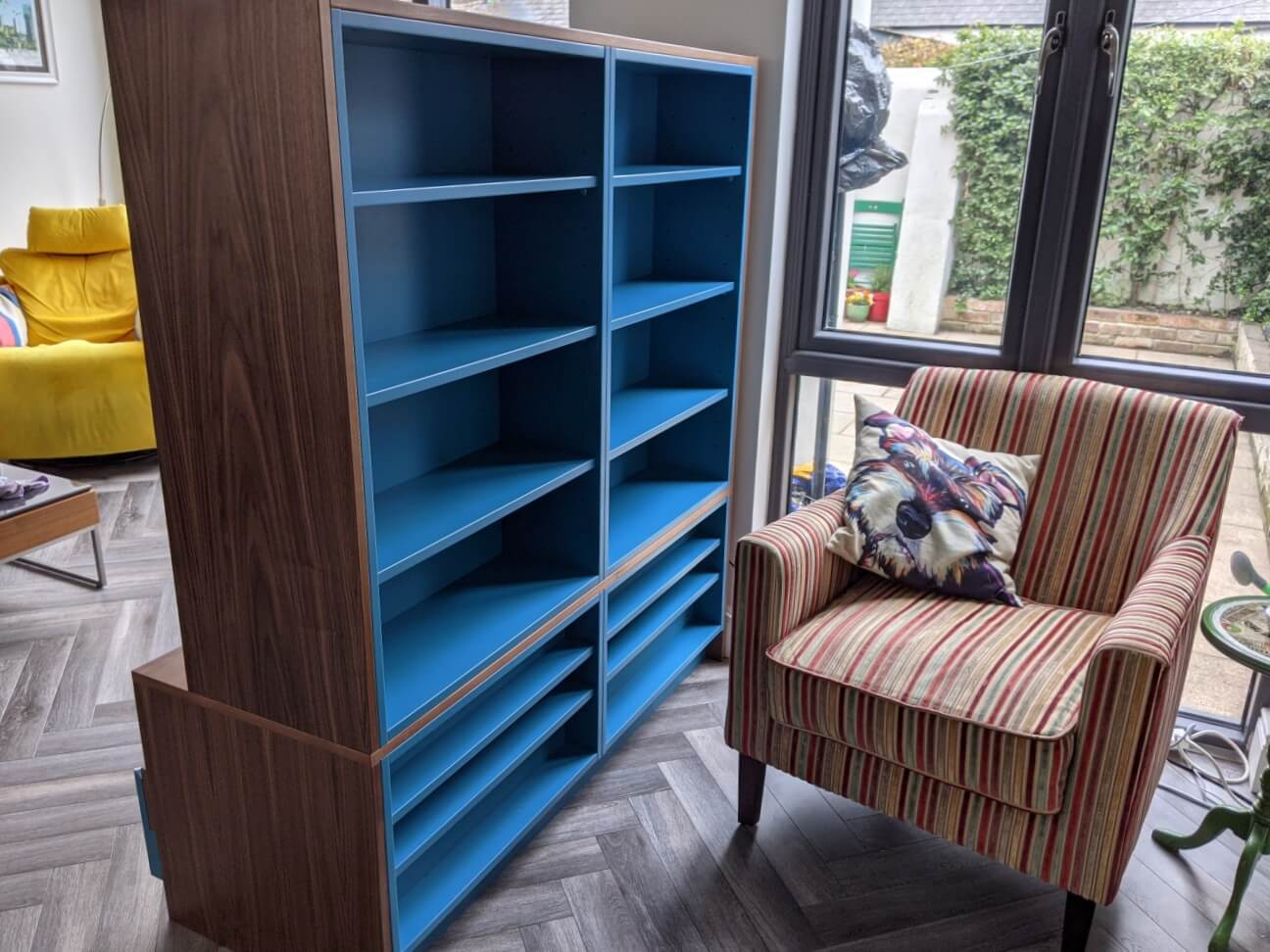 This TV unit and shelving solution works as a smart room divider, displaying the tendency for darker wood shades and the contrasting bright blue colour. A truly unique piece of furniture is a remarkable addition to any home.